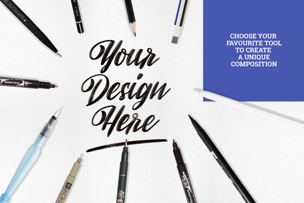 These mockups are perfect to display your lettering pieces on Instagram and other social media or your personal portfolio on your website. The most popular lettering pens, brush pens and pencils are included. The mockups are very easy to use, just replace the smart layer with your lettering design, save and post it!
